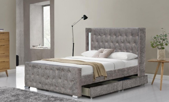 Из бархатного материала, удобный для сна и легкий в уборке. В то же время, он украшен бриллиантовой кнопкой на головной панели и светодиодными огнями. Простой с модной.