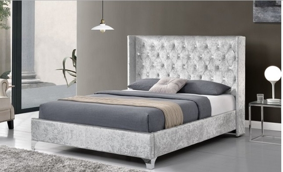 Эта кровать выглядит очень высокой и элегантной, с бархатной тканью на поверхности и кристаллическими пуговицами. Она блестящая и красивая. Она действительно великолепна. Дизайн крыльев головки добавляет вкусу этой кровати!